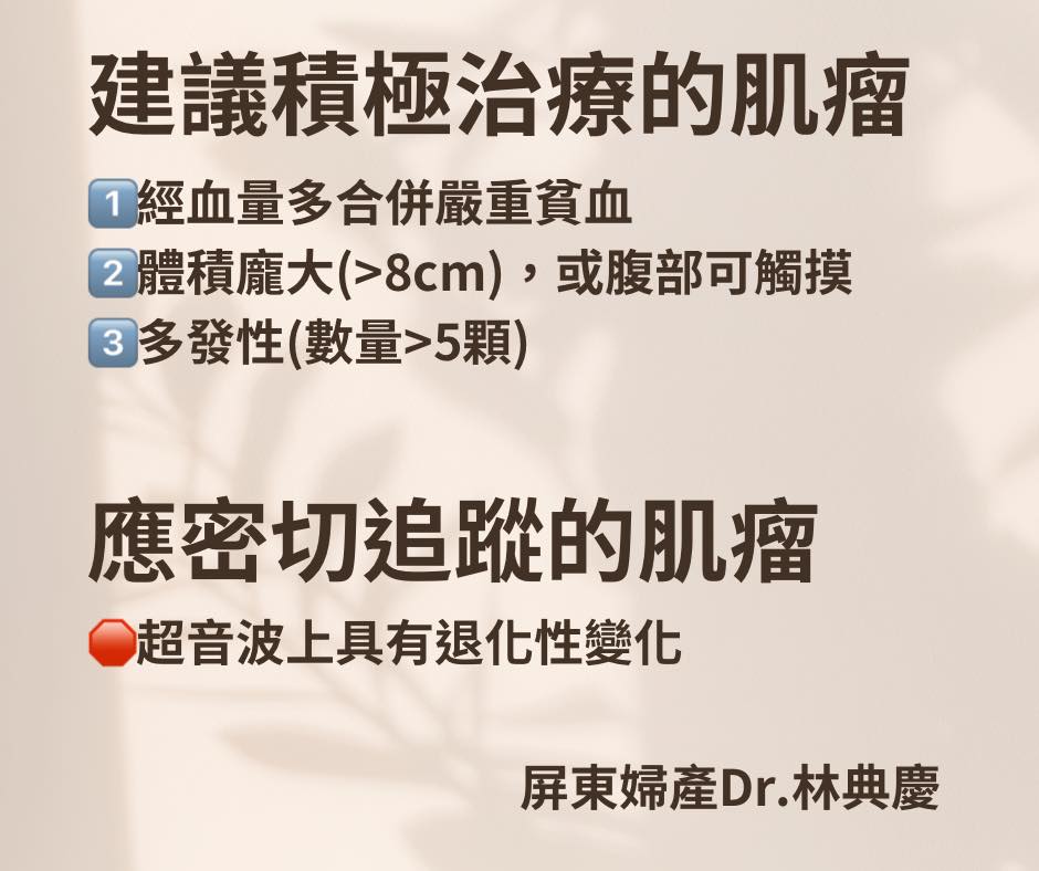 由以上分析可以知道,大部分的肌瘤是良性的,而且也是無症狀居多,所以大部分的肌瘤都只要追蹤即可。但是少部分的肌瘤造成臨床症狀時,就建議積極治療